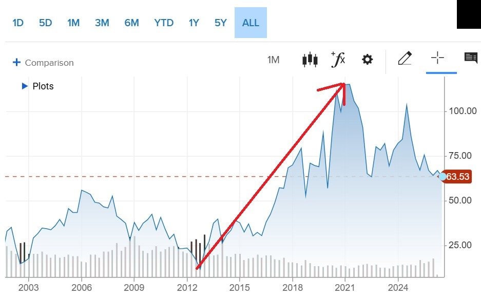 Biểu đồ giá cổ phiếu Best Buy tăng mạnh sau giai đoạn khó khăn năm 2012 (Nguồn CNBC).