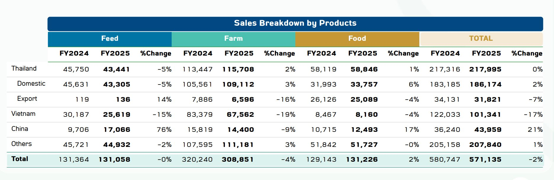 Doanh thu này của CPF tại Việt Nam có phần lớn nhất đến từ chăn nuôi (farm) với 67,9 tỷ baht (57 nghìn tỷ đồng), chiếm 67% tổng; thức ăn chăn nuôi (feed) với 25,3 tỷ baht (21,3 nghìn tỷ đồng), đóng góp 25%; và thực phẩm (food) với 8,1 tỷ baht (6,8 nghìn tỷ đồng), tương đương 3% tổng.