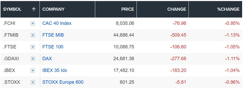Thị trường chứng khoán châu Âu giảm điểm trong phiên ngày 20/1, khi nguy cơ về một vòng thuế quan mới tiếp tục phủ bóng lên tâm lý nhà đầu tư. Chỉ số Stoxx 600 toàn châu Âu giảm khoảng 0,7% ngay sau khi mở cửa. Tất cả các nhóm ngành và thị trường chung đều chìm trong sắc đỏ.