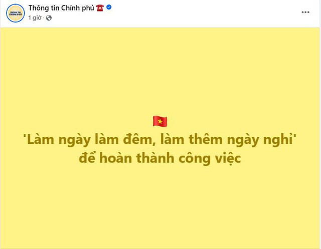 Ngày 4/6, trang fanpage chính thức “Thông tin Chính phủ” đã đăng tải một thông điệp ngắn gọn nhưng tạo hiệu ứng mạnh mẽ trên mạng xã hội: “Làm ngày làm đêm, làm thêm ngày nghỉ để hoàn thành công việc.” Dòng trạng thái này nhanh chóng thu hút sự quan tâm lớn của cộng đồng, với gần 19.000 lượt tương tác và hàng trăm bình luận chỉ sau 1 giờ đăng tải.
