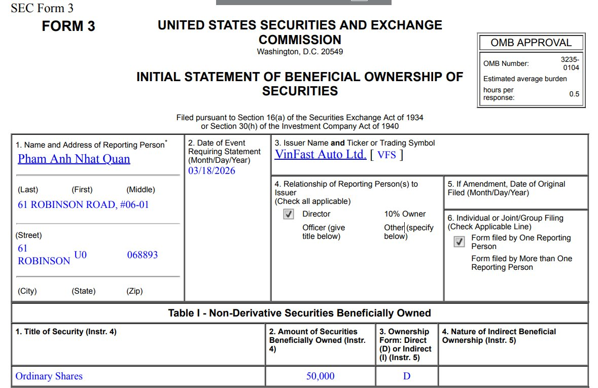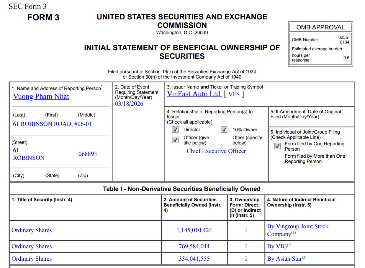 VinFast (NASDAQ: VFS) vừa có 1 loạt báo cáo về lượng cổ phiếu VFS do lãnh đạo của mình nắm giữ, trong đó phần lớn cổ phần do tổ chức có liên quan hoặc cá nhân 3 người Việt gồm tỷ phú Phạm Nhật Vượng, Chủ tịch HĐQT Lê Thị Thu Thủy, và con trai ông Phạm Nhật Vượng là Phạm Nhật Quân Anh nắm giữ.