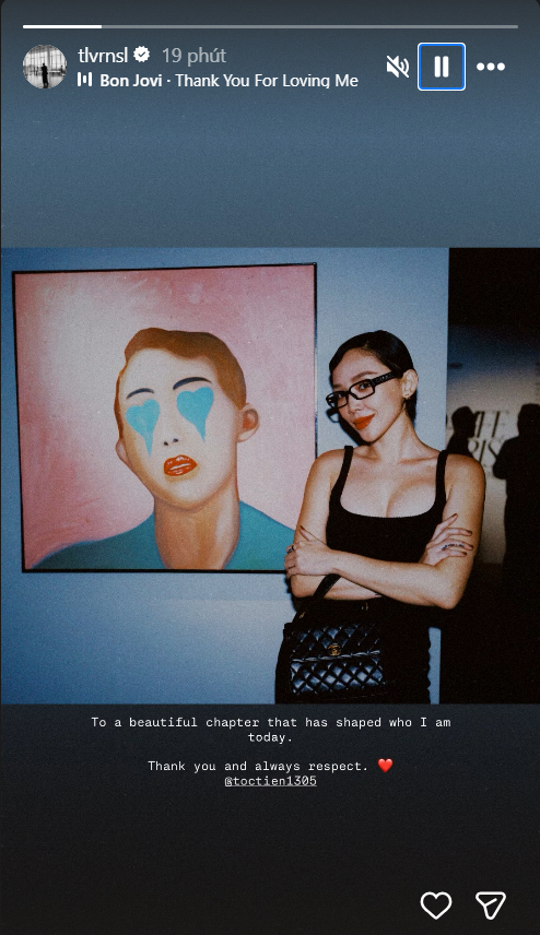 Sau khi Tóc Tiên có bài đăng trên, Touliver cũng đã viết dòng trạng thái trên Instagram cá nhân: “Gửi đến một chương đẹp đã đã góp phần tạo nên con người tôi của hôm nay. Xin gửi lời cảm ơn và sự trân trọng mãi mãi”.