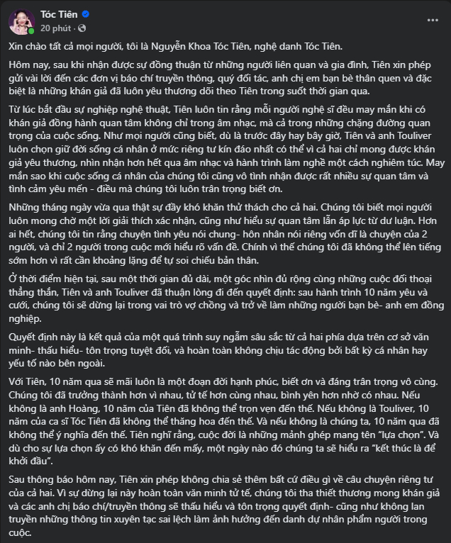 Vào ngày 17/1, nữ ca sĩ Tóc Tiên đã chính thức lên tiếng về mối quan hệ với Touliver sau 10 yêu và cưới trên trang cá nhân. Bài viết hiện đang thu hút lượng lớn tương tác từ người hâm mộ. Tuy nhiên, nữ ca sĩ đã khoá chế độ bình luận ở bài viết này.