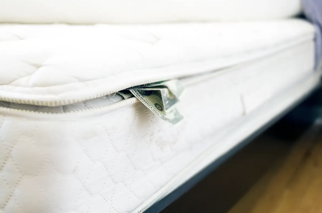 Số tiền lớn được cất giấu dưới đệm, với các tờ tiền mệnh giá 20, 50 và 100 USD.