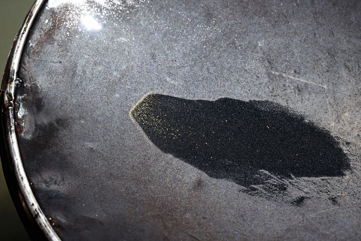 Nhiều người khác thì dùng những chiếc can nhựa màu vàng có cán dài bằng gỗ để đổ nước sông lên các tấm sàng. Sau hai lần sàng lọc nữa, những cục vàng thỉnh thoảng sẽ xuất hiện trong các chậu kim loại.