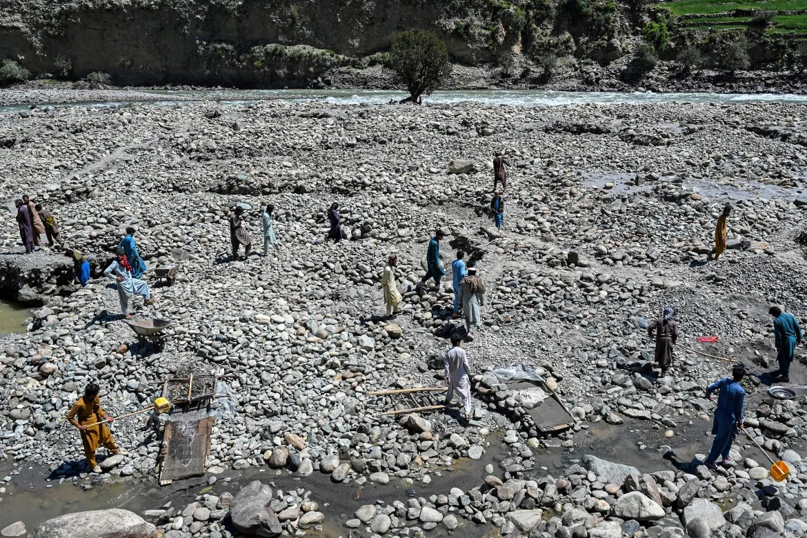 Gần làng Kharwalu thuộc tỉnh Kunar – nơi nổi tiếng với những ngôi nhà xây bằng gạch bùn và những thửa ruộng bậc thang trồng lúa mì – người dân đào bới những đoạn lòng sông khô cạn trước khi dùng nước sông để rửa sạch những rổ cát đá mà họ đào được.