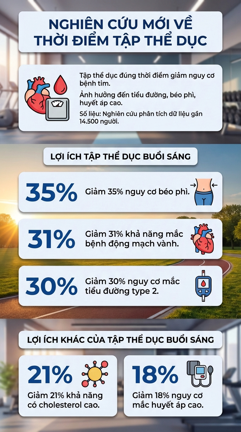 Nghiên cứu phát hiện rằng tập thể dục vào một thời điểm nhất định trong ngày có thể làm giảm nguy cơ mắc tiểu đường, béo phì và huyết áp cao, qua đó cải thiện sức khỏe tim mạch.