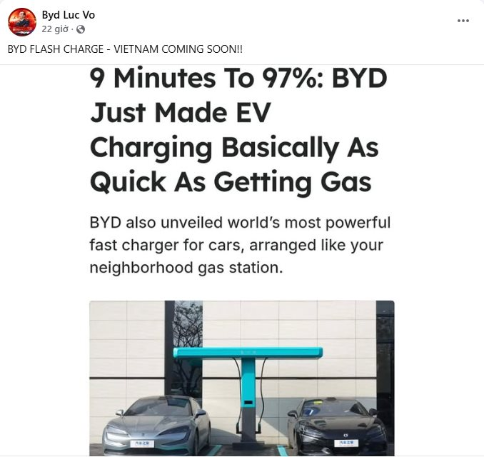 Thông tin này được ông Võ Minh Lực – Giám đốc điều hành BYD Việt Nam – chia sẻ trên mạng xã hội với thông điệp “BYD Flash Charge – Vietnam coming soon”. Dù chưa có thời điểm cụ thể, động thái này cho thấy hãng xe điện Trung Quốc đang tính toán mở rộng hệ sinh thái hạ tầng sạc tại thị trường Việt Nam.