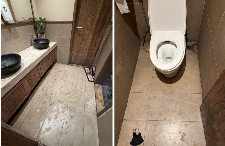Tại khu vực nhà vệ sinh ở cả tầng 1 và tầng 2, sàn xuất hiện nhiều dấu chân do khách dẫm vào nước rồi di chuyển vào bên trong.