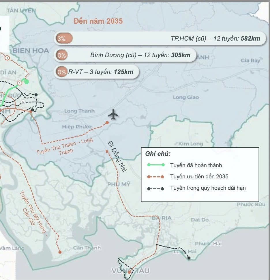 Theo Ban Quản lý đường sắt đô thị TP. Hồ Chí Minh, từ nay đến trước năm 2035, thành phố dự kiến đầu tư khoảng 37,15 tỷ USD để phát triển 9 tuyến Metro, gồm 6 tuyến ở khu vực trung tâm, 2 tuyến tại Bình Dương (cũ) và 1 tuyến hướng Vũng Tàu (cũ).