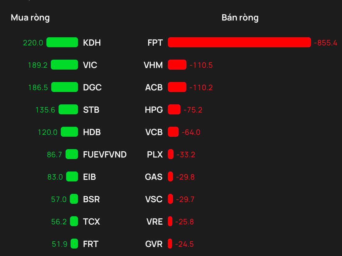 Ngược lại, FPT là cổ phiếu khối ngoại bán mạnh nhất với 855 tỷ đồng. Theo sau, các cổ phiếu VHM và ACB cũng bị "xả" 110 tỷ đồng và 110 tỷ đồng.