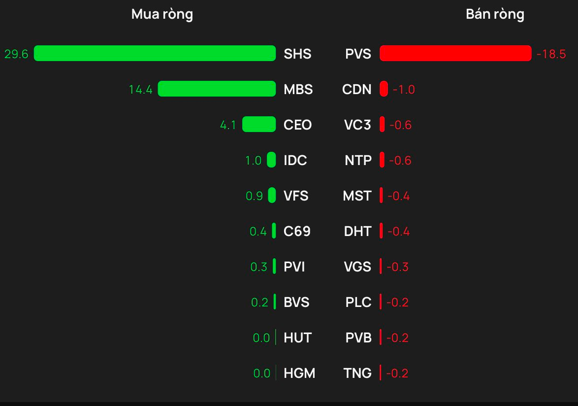Tại chiều mua, SHS được mua ròng mạnh nhất với giá trị 30 tỷ đồng. Bên cạnh đó, MBS xếp tiếp theo trong sách mua ròng mạnh trên HNX với 14 tỷ đồng. Ngoài ra, khối ngoại cũng chi vài tỷ đồng để gom ròng CEO, IDC, VFS.