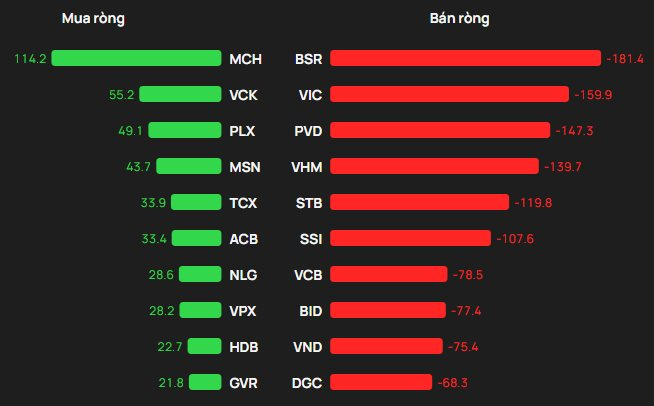 Tại chiều mua, cổ phiếu MCH được khối ngoại mua mạnh nhất trên HOSE với giá trị hơn 114 tỷ đồng. Theo sau, VCK và PLX là mã tiếp theo được gom mạnh 55 tỷ đồng và 49 tỷ đồng.