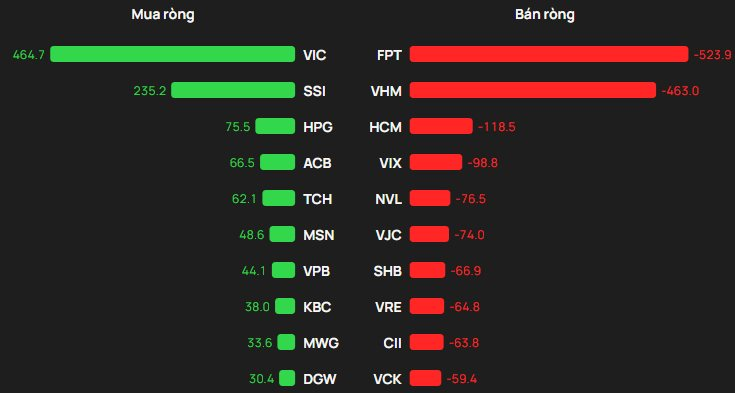 Ngược lại, FPT tiếp tục bị khối ngoại bán mạnh nhất với 524 tỷ đồng. Theo sau, các cổ phiếu VHM và HCM cũng bị "xả" 463 tỷ đồng và 119 tỷ đồng.