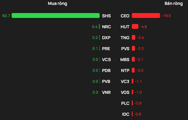 Tại chiều mua, SHS được mua ròng mạnh nhất với giá trị 61 tỷ đồng. Bên cạnh đó, NRC xếp tiếp theo trong sách mua ròng mạnh trên HNX với 0,4 tỷ đồng. Ngoài ra, khối ngoại cũng chi vài tỷ đồng để gom ròng DXP, PRE, VCS.