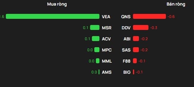 Chiều mua, cổ phiếu VEA được khối ngoại mua 2 tỷ đồng. Theo sau, MSR và ACV cũng được mua ròng mỗi mã vài trăm triệu đồng.