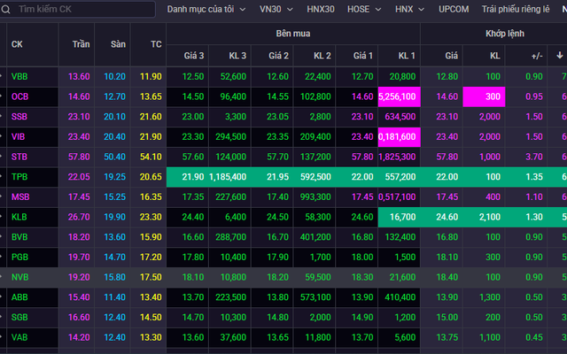 Kết phiên 21/8, toàn bộ 27 mã ngân hàng trên cả ba sản chứng khoán HOSE, HNX và UPCoM đều tràn ngập trong sắc xanh. Trong đó, có 6 mã tăng trần là OCB, VIB, MSB, STB, SSB và TPB.