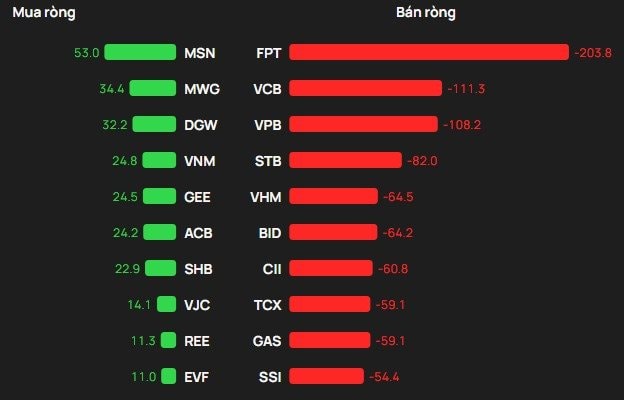 Tại chiều mua, cổ phiếu MSN được khối ngoại mua mạnh nhất trên HOSE với giá trị hơn 53 tỷ đồng. Theo sau, MWG và DGW là mã tiếp theo được gom mạnh 34 tỷ đồng và 32 tỷ đồng.