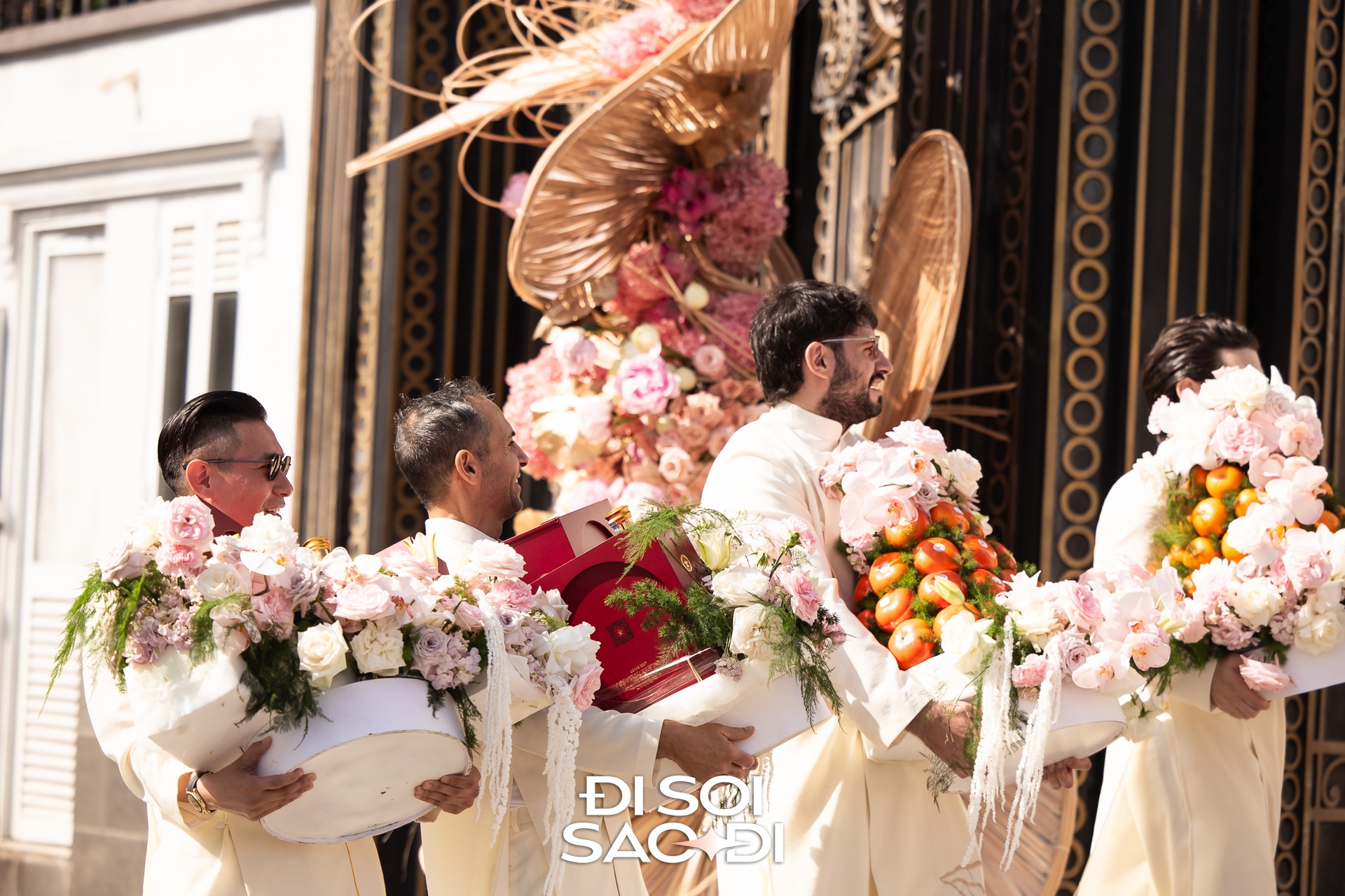 Trong lễ gia tiên sáng nay, bên ngoài khu biệt thự, dàn vệ sĩ đã đứng túc trực sẵn để đảm bảo an ninh. Dàn xế sang của khách mời, anh em nhà tỷ phú cũng đang đổ bộ. Đúng chất nhà có hỷ sự, biệt thự bật những bài hát nghe vào đã thấy rần rần không khí cưới xin. Tối cùng ngày, lễ cưới của Tiên Nguyễn và Justin Cohen sẽ diễn ra tại trung tâm tiệc cưới sang trọng ở TP.HCM, dự quy tụ nhiều gương mặt đình đám Vbiz đổ bộ.