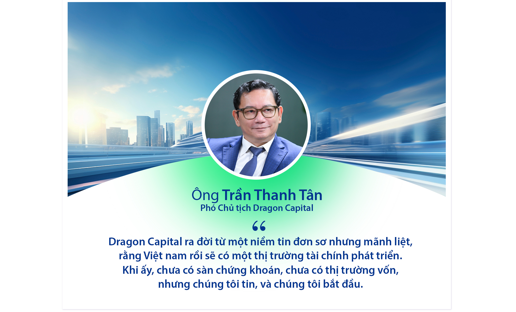 Ông Trần Thanh Tân: Dragon Capital thành lập dựa trên nhiều yếu tố, tin rằng Việt Nam sẽ có thị trường chứng khoán. Lúc đó tôi phụ trách chính mảng cổ phần hoá. Tôi đã tư vấn cho REE, GMD, LAFOOCO, VIFOOCO và nhiều công ty quốc doanh khác cổ phần hoá và niêm yết trên thị trường chứng khoán sau này. Đó là một bước chuẩn bị hàng hoá cho thị trường chứng khoán mà mình nghĩ sẽ được thành lập sớm.