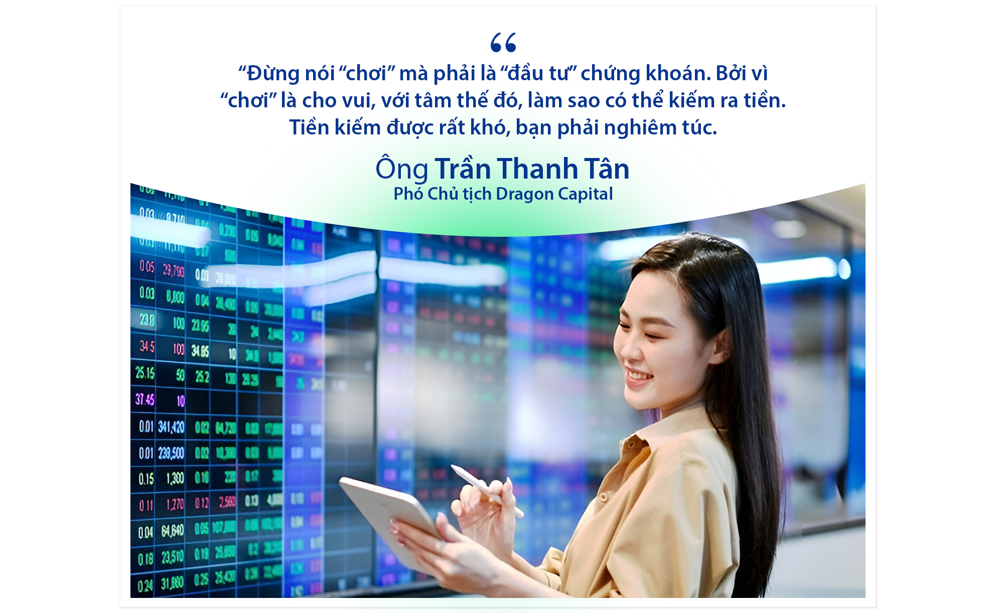 Ông Trần Thanh Tân: Các nhà đầu tư bây giờ khác rất xa so với những nhà đầu tư cách đây 10 năm, 20 năm. Họ năng động hơn nhiều, giỏi hơn nhiều, hiểu biết hơn nhiều. Với những người mới gia nhập thị trường, điều đầu tiên tôi khuyên là đừng nói rằng mình "chơi" chứng khoán, mà phải nói rằng tôi đang "đầu tư" chứng khoán. Bởi vì "chơi" là cho vui, với tâm thế đó, làm sao có thể kiếm ra tiền. Tiền kiếm được rất khó, bạn phải nghiêm túc.
