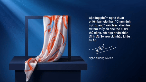 Thì chiếc khăn lụa tơ tằm chế tác 100% thủ công bằng kỹ thuật thủy ấn và đính đá Swarovski được lựa chọn. Nghệ sĩ Đặng Tố Anh đã vẽ trực tiếp trên mặt nước, để từng chuyển động của sắc màu được "bắt" lại trên lụa trong một khoảnh khắc duy nhất. Không có cách nào lặp lại. Mỗi chiếc khăn là một phiên bản độc bản.