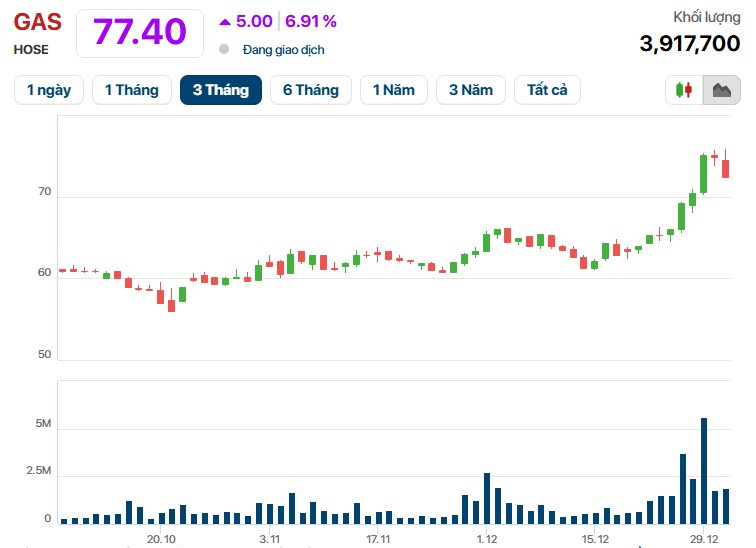 Phiên giao dịch đầu năm, cổ phiếu PV GAS đã tăng hết biên độ lên mức giá trần 77.400 đồng/cp. Vốn hóa doanh nghiệp đạt gần 187.000 tỷ đồng