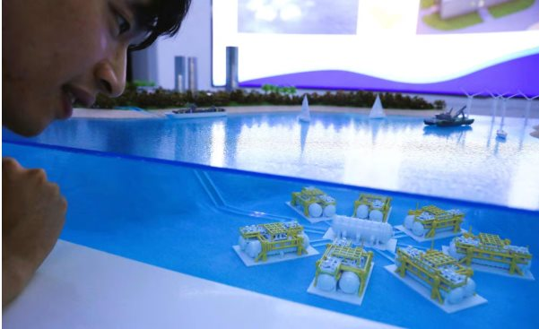 Một du khách đang quan sát mô hình thu nhỏ của các cabin dữ liệu dưới biển dành cho một trung tâm dữ liệu dưới biển, tại Linh Thủy, tỉnh Hải Nam, miền nam Trung Quốc (Ảnh: SCMP)