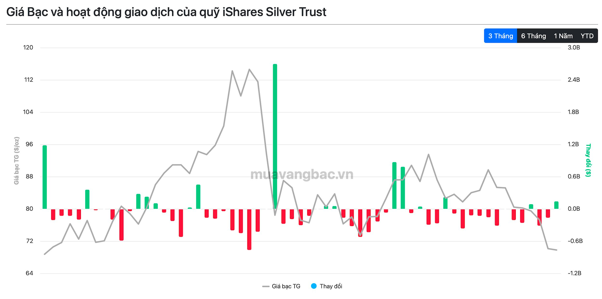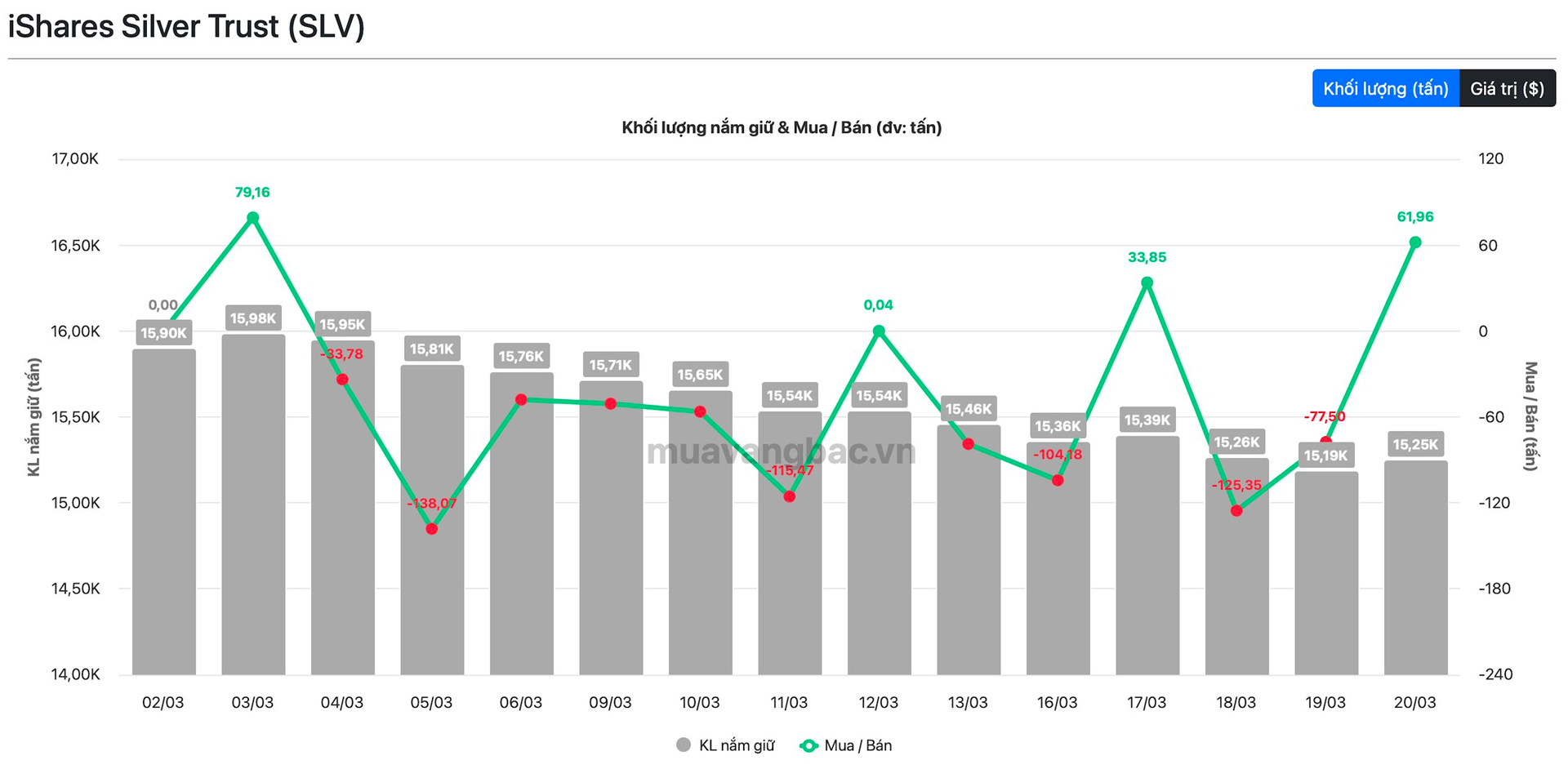 Theo dữ liệu từ Muavangbac.vn, iShare Silver Trust (SLV) vừa mạnh tay chi hơn 140 triệu USD mua gần 62 tấn bạc trong ngày 20/3. Đây là khối lượng mua vào lớn nhất của quỹ kể từ khi chiến sự tại Trung Đông nổ ra ngày 3/3. Động thái của SLV diễn ra trong bối cảnh giá bạc lao dốc xuống dưới 70 USD/oz, giảm gần một nửa so với đỉnh.