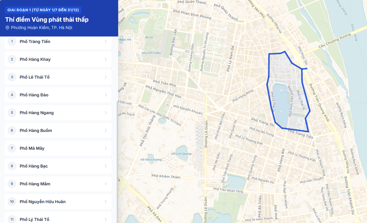 Trong giai đoạn đầu (từ 1/7 đến 31/12/2026), Hà Nội chọn phường Hoàn Kiếm làm địa bàn thí điểm. Vùng hạn chế bao gồm mạng lưới 11 tuyến phố huyết mạch: Tràng Tiền, Hàng Khay, Lê Thái Tổ, Hàng Đào, Hàng Ngang, Hàng Buồm, Mã Mây, Hàng Bạc, Hàng Mắm, Nguyễn Hữu Huân và Lý Thái Tổ.