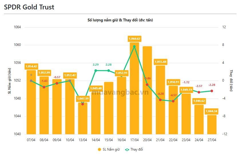 Sau giao dịch, tổng lượng vàng SPDR Gold Trust nắm giữ giảm còn khoảng 1.044 tấn.