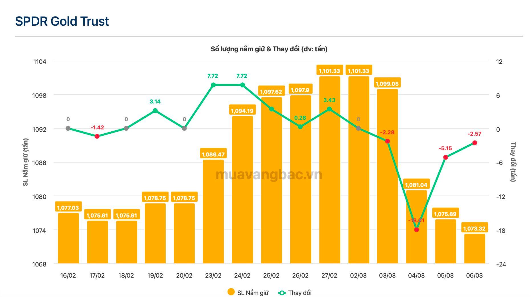 Theo dữ liệu từ Muavangbac.vn, quỹ vàng lớn nhất thế giới SPDR Gold Trust tiếp tục bán ròng 2,57 tấn vàng trong ngày 6/3, kéo tổng lượng nắm giữ xuống dưới 1.073 tấn. Đây là phiên bán ròng thứ tư liên tiếp của quỹ này, với tổng khối lượng xả lên tới 28 tấn vàng.