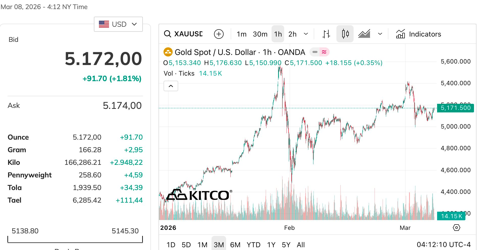 Dữ liệu từ sàn Kitco cho biết, giá vàng giao ngay tại thị trường New York đang neo quanh mức 5.172 USD/oz. Trước đó, căng thẳng địa chính trị đã đẩy giá vàng tăng vọt lên 5.400 USD/ounce, nhưng đà tăng nhanh chóng đảo chiều khi lực bán chốt lời gia tăng, khiến giá kim loại quý quay đầu giảm.