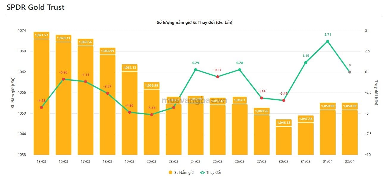 Trong bối cảnh biến động mạnh, theo dữ liệu từ Muavangbac.vn, quỹ vàng lớn nhất thế giới SPDR Gold Trust đã tạm thời “đứng im” quan sát thị trường, chấm dứt chuỗi hai phiên mua ròng liên tiếp và duy trì lượng nắm giữ ở mức 1.050 tấn.
