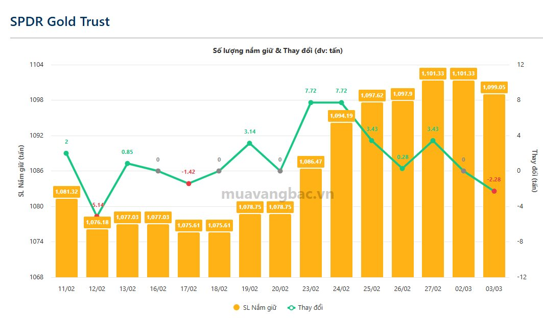 Theo dữ liệu từ Muavangbac.vn, quỹ vàng lớn nhất thế giới SPDR Gold Trust đã quay đầu bán ròng 2,28 tấn vàng trong ngày 3/3, đưa tổng lượng vàng nắm giữ về dưới mức 1.100 tấn. Động thái này diễn ra sau khi quỹ đã có nhiều phiên liên tiếp gom vàng trước đó.