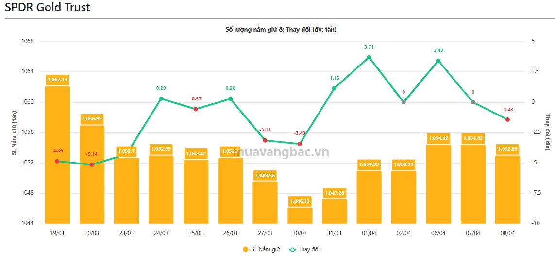 Theo cập nhật từ Muavangbac.vn, quỹ vàng lớn nhất thế giới SPDR Gold Trust đã bán ròng trở lại trong ngày 8/4, với hơn 1,4 tấn vàng “rời kho”, qua đó giảm tổng lượng nắm giữ xuống 1.053 tấn. Đây là phiên đầu tiên quỹ vàng quay đầu bán ròng kể từ đầu tháng 4 tới nay, sau khi gom khoảng gần 7 tấn.