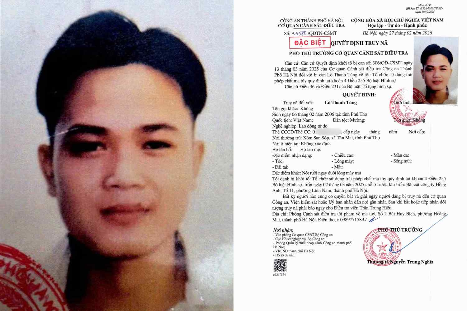 Cơ quan Cảnh sát điều tra Công an TP Hà Nội ngày 9/4 cho biết đang truy nã đối tượng Lò Thanh Tùng (SN 2006; thường trú tại: xã Tân Mai, tỉnh Phú Thọ) về tội Tổ chức sử dụng trái phép chất ma túy.
