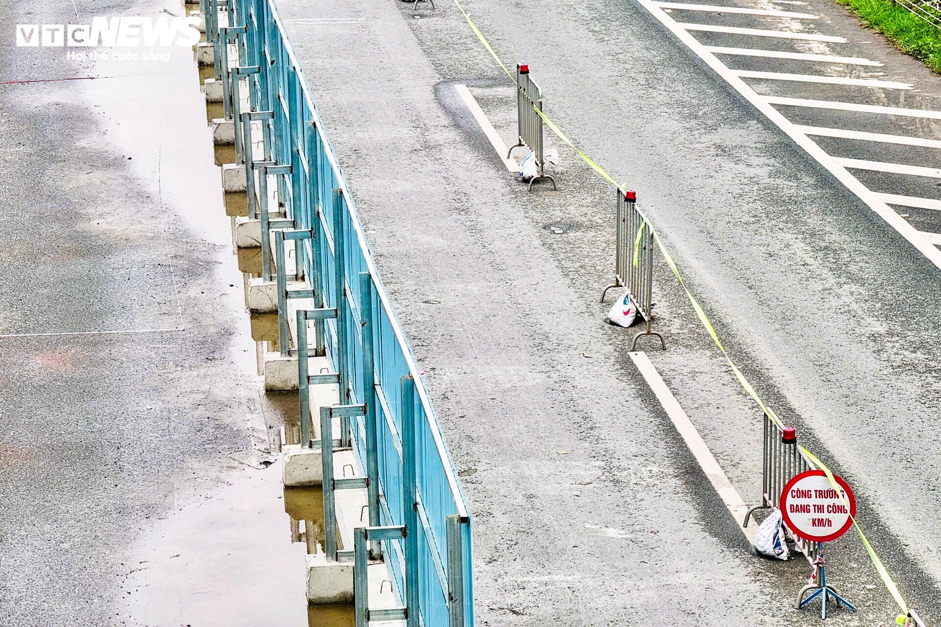 Tại khu vực thi công, hai làn đường đã được quây rào, bên trong các công nhân cùng máy móc đang triển khai các hạng mục theo kế hoạch.
