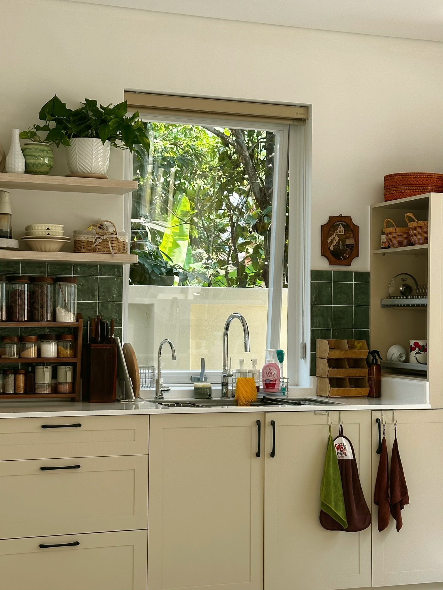 Căn bếp được thiết kế theo dạng chữ I, kết hợp với đảo bếp nhỏ. Nhờ hệ cửa kính bao quanh, không gian luôn tràn ngập ánh sáng tự nhiên. Bảo Nhi thậm chí còn mạnh dạn loại bỏ tủ bếp trên để tạo cảm giác thoáng đãng cho không gian bếp. "Bếp chữ I và đảo bếp là đủ dùng cho cả nhà, nên mình bỏ tủ trên để không gian nhẹ và xinh hơn".
