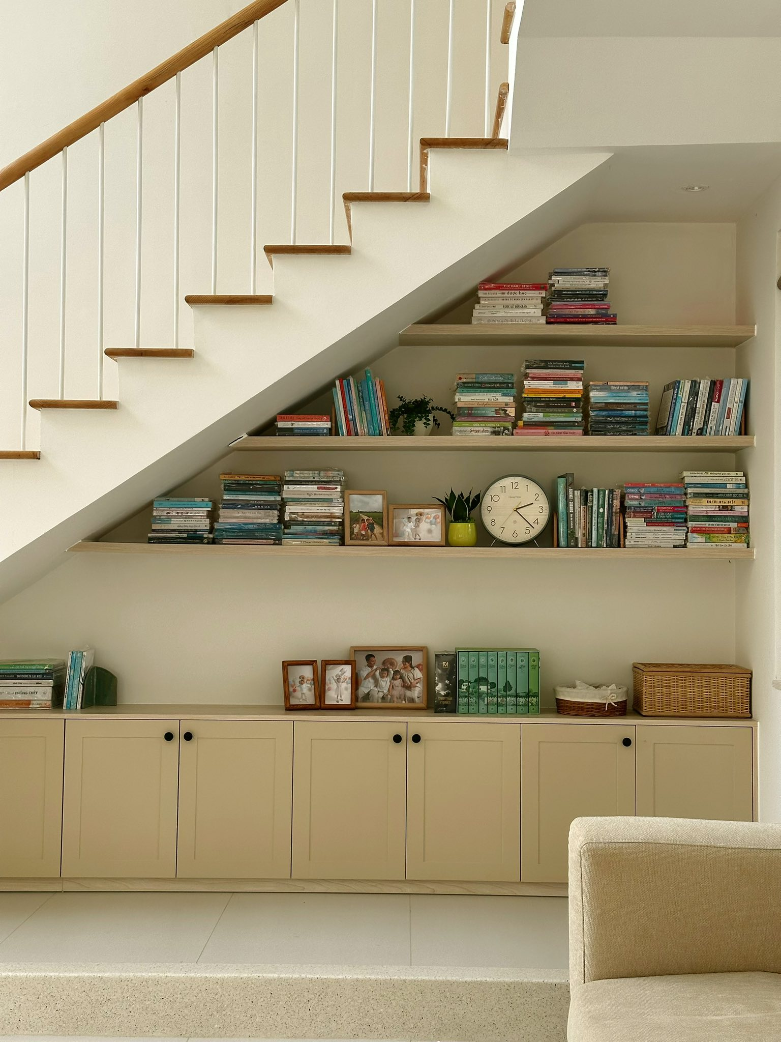 Không gian tầng trệt không chỉ là nơi sinh hoạt chung, mà gần như là trung tâm của toàn bộ đời sống gia đình. " Những ngày con không đi học, phần lớn thời gian cả nhà mình sẽ ở đây. Ba mẹ làm việc, các con chơi, hoặc cùng nhau làm những điều mình thích".