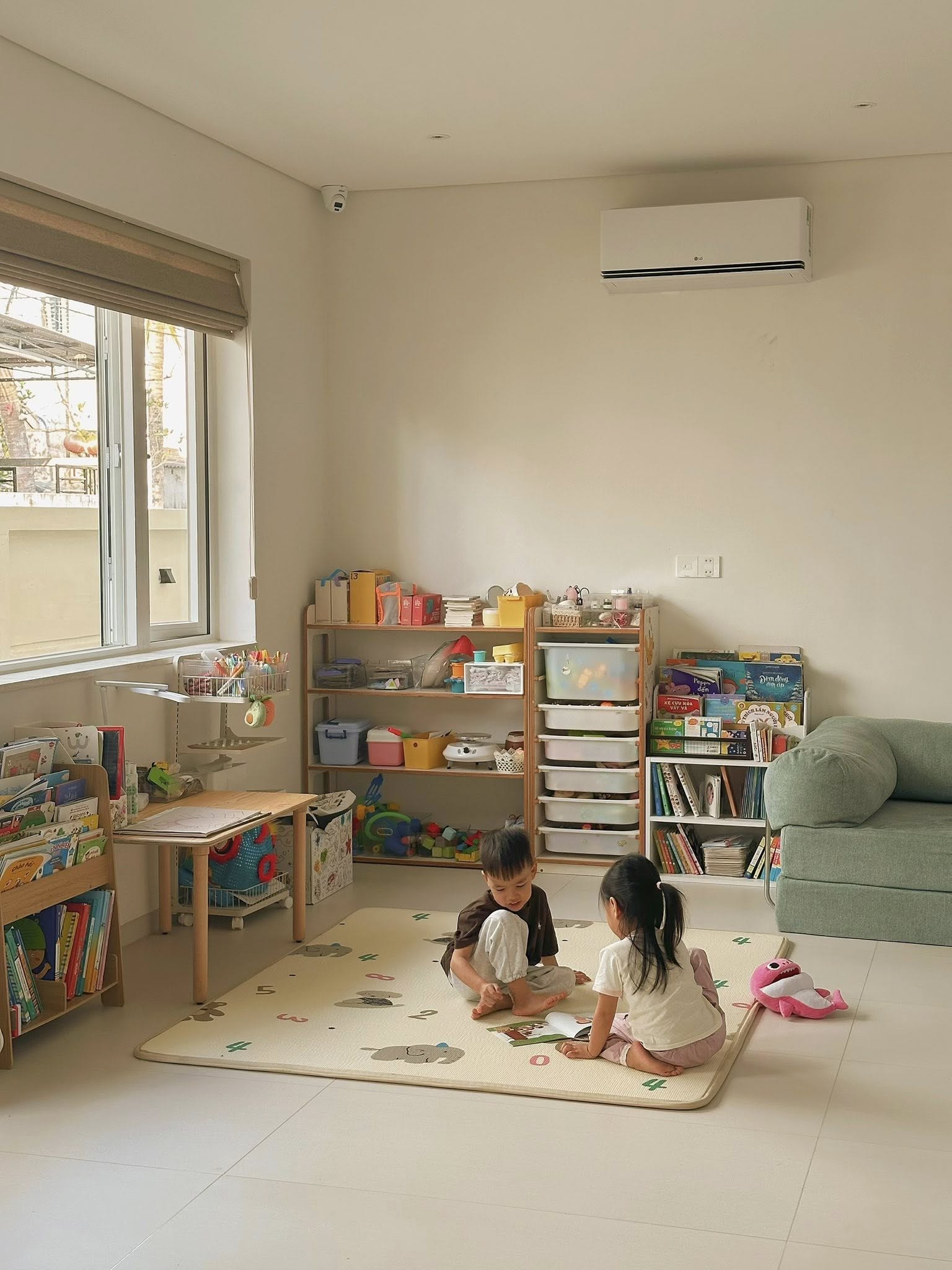 Điều thú vị là, dù có phòng riêng ở tầng trên, các bé lại rất thích ở không gian chung này. Ngay cả những kỳ nghỉ dài, khi không đi du lịch, ngôi nhà vẫn đủ để các bé bày đủ trò. "Trong nhà chán thì ra sân chơi, giống như hồi trước ở chung cư thì ra ban công hoặc xuống tầng tiện ích".