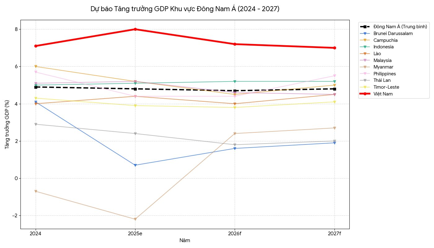 Bức tranh tăng trưởng GDP của khu vực Đông Nam Á giai đoạn 2024 - 2027 cho thấy sự phân hóa tương đối rõ rệt giữa các nền kinh tế. Điểm sáng lớn nhất và đóng vai trò đầu tàu tăng trưởng của khu vực chính là Việt Nam, với tốc độ tăng trưởng GDP dự kiến đạt 7,2% trong năm nay, cao nhất trong khu vực.