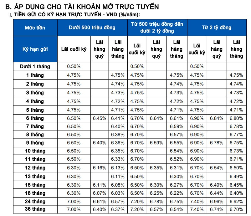 Cụ thể, với hình thức lĩnh lãi cuối kỳ, lãi suất kỳ hạn 1–5 tháng vẫn ở mức 4,75%/năm. Đối với các kỳ hạn từ 6–11 tháng, lãi suất được niêm yết 6,50%/năm đối với khoản dưới 500 triệu đồng, 6,70%/năm đối với khoản từ 500 triệu đồng đến dưới 2 tỷ đồng và 6,90%/năm đối với khoản từ 2 tỷ đồng trở lên.