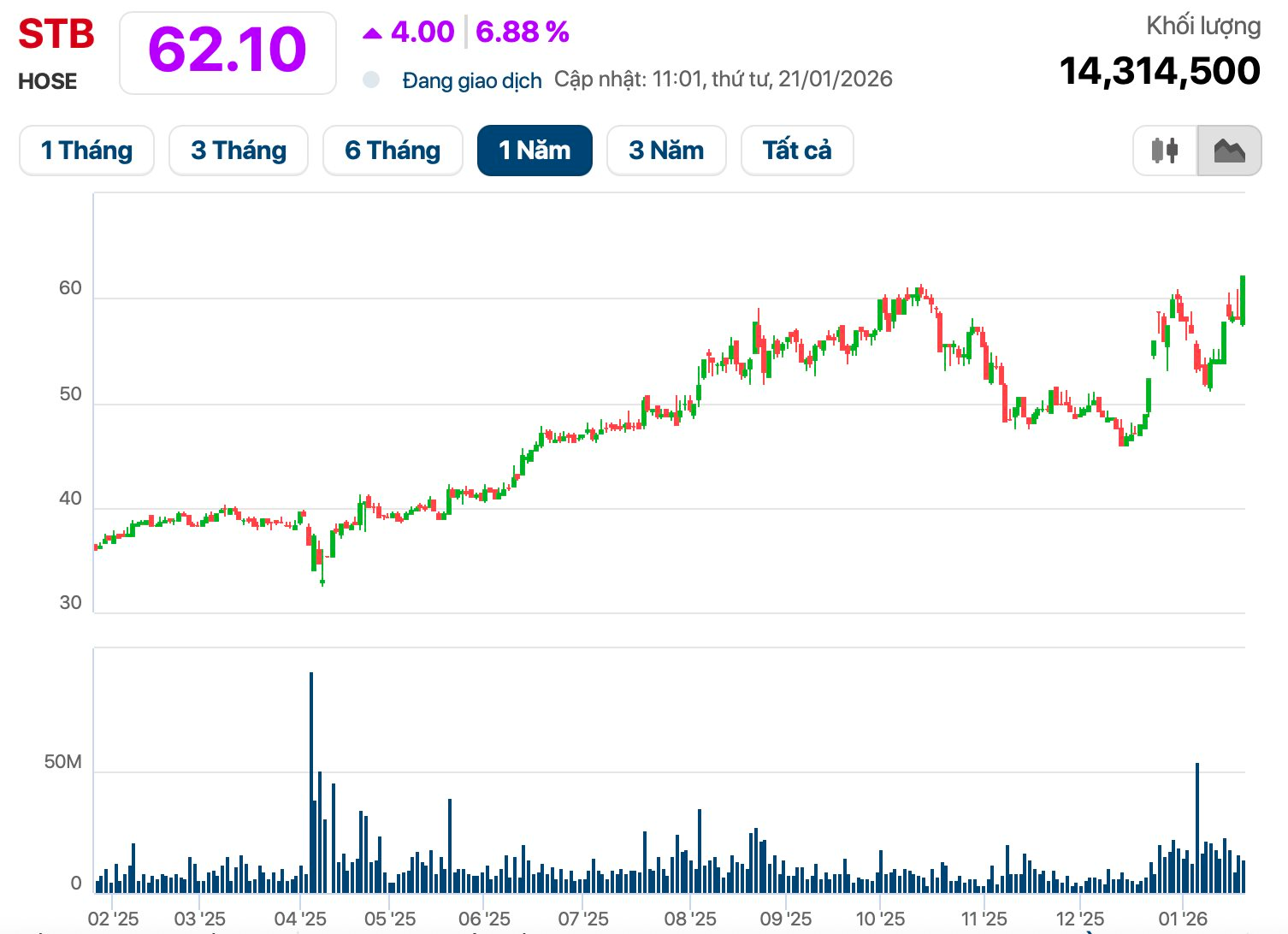 Cổ phiếu STB tăng bốc đầu trong bối cảnh nhà đầu tư đang “nín thở” chờ đợi những biến động thượng tầng. Theo kế hoạch, Sacombank sẽ gửi thông báo cho cổ đông về việc đề cử thành viên HĐQT nhiệm kỳ 2022-2026 từ hôm nay (21/1/2026). Thời gian nhận hồ sơ đề cử gửi về văn phòng HĐQT Sacombank chậm nhất 17h ngày 6/2/2026.