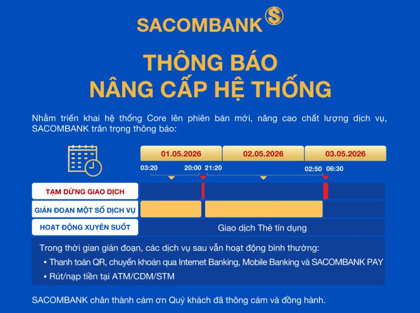 Sacombank vừa thông báo về việc nâng cấp hệ thống nhằm triển khai hệ thống Core lên phiên bản mới. Việc nâng cấp diễn ra trong 3 ngày, từ 01/05/2026 đến 03/05/2026.