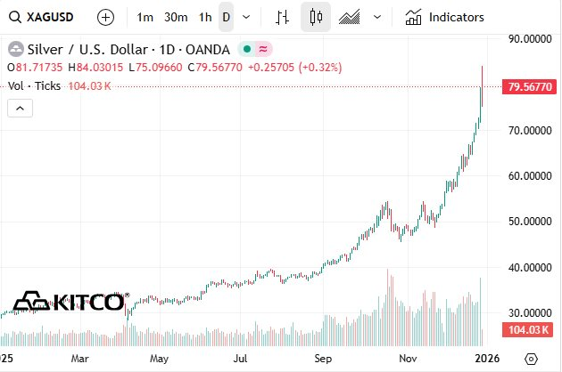Bạc đang trên đà có năm tăng giá mạnh nhất kể từ năm 1979 khi Trung Quốc công bố siết chặt kiểm soát xuất khẩu, góp phần thúc đẩy giá bạc tăng vọt. Giá kim loại quý đã tăng lên mức cao kỷ lục 80 USD/ounce vào 29/12. Giá bạc hiện đã tăng xấp xỉ 170% kể từ đầu năm, gấp hơn hai lần mức tăng 72% của giá vàng trong cùng thời điểm.