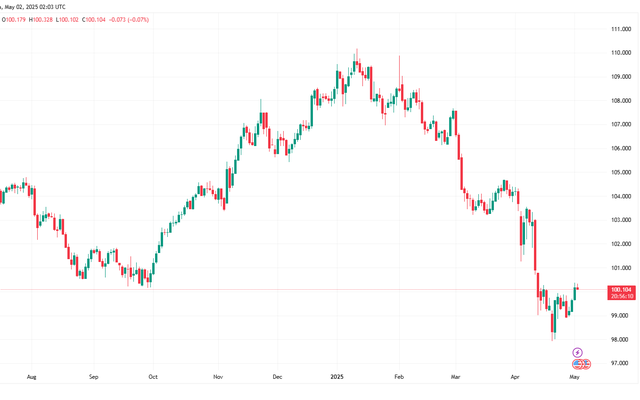 Tính đến 9h sáng nay, chỉ số đô la Mỹ ở mức 100,104, giảm 0,073 (0,07%) so với đầu phiên.