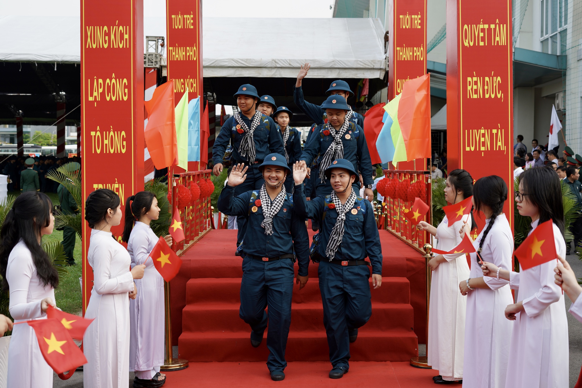 Sau phần nghi thức bàn giao quân số giữa địa phương và đơn vị nhận quân, các tân binh lần lượt lên xe về đơn vị mới. Hình ảnh những cánh tay vẫy chào, những ánh mắt dõi theo đến khi xe khuất hẳn đã tạo nên khoảnh khắc xúc động trong buổi sáng Ngày hội tòng quân.