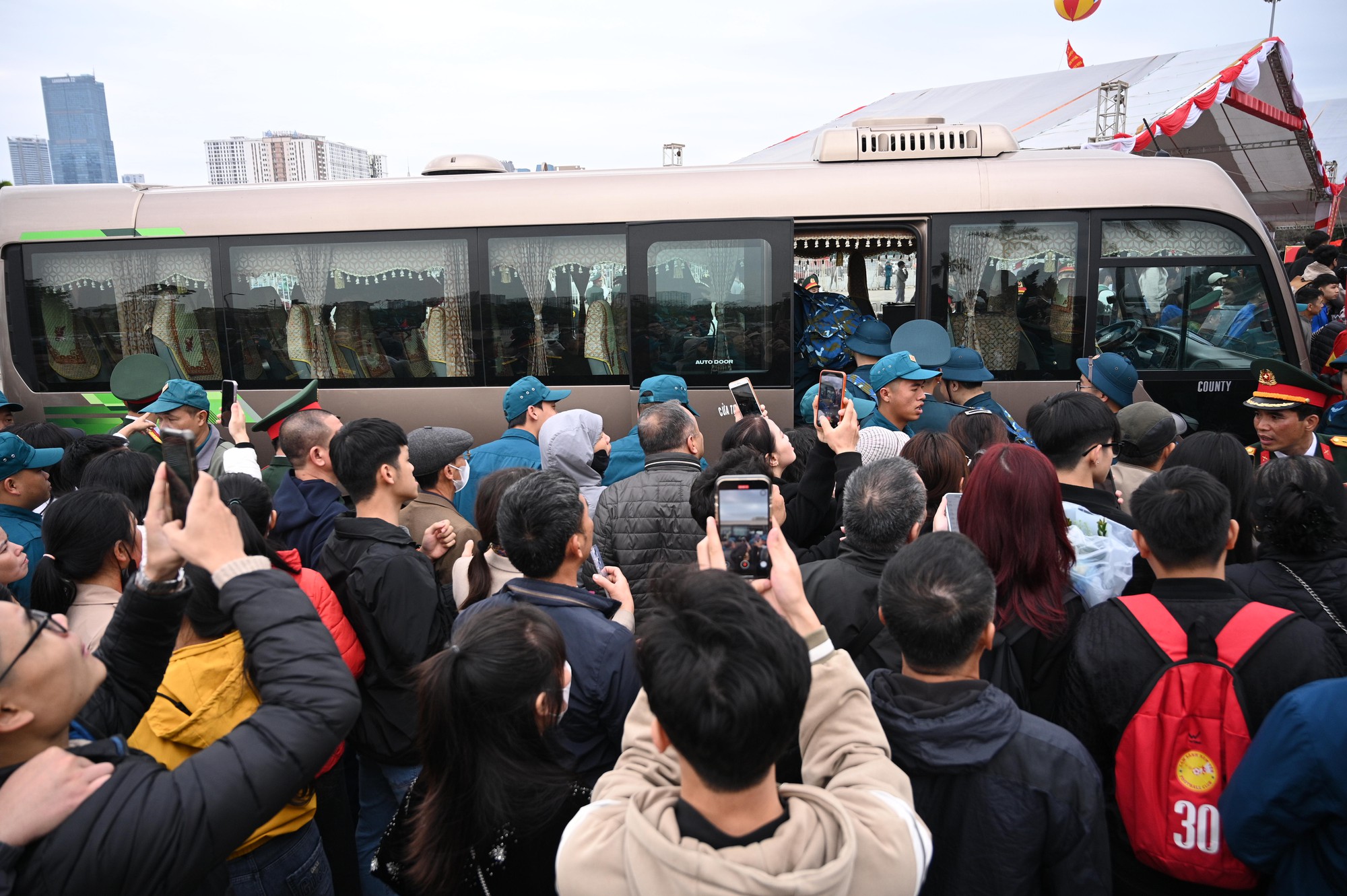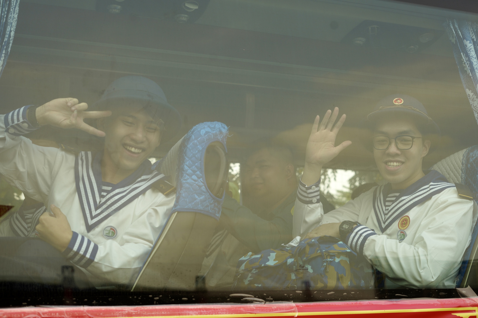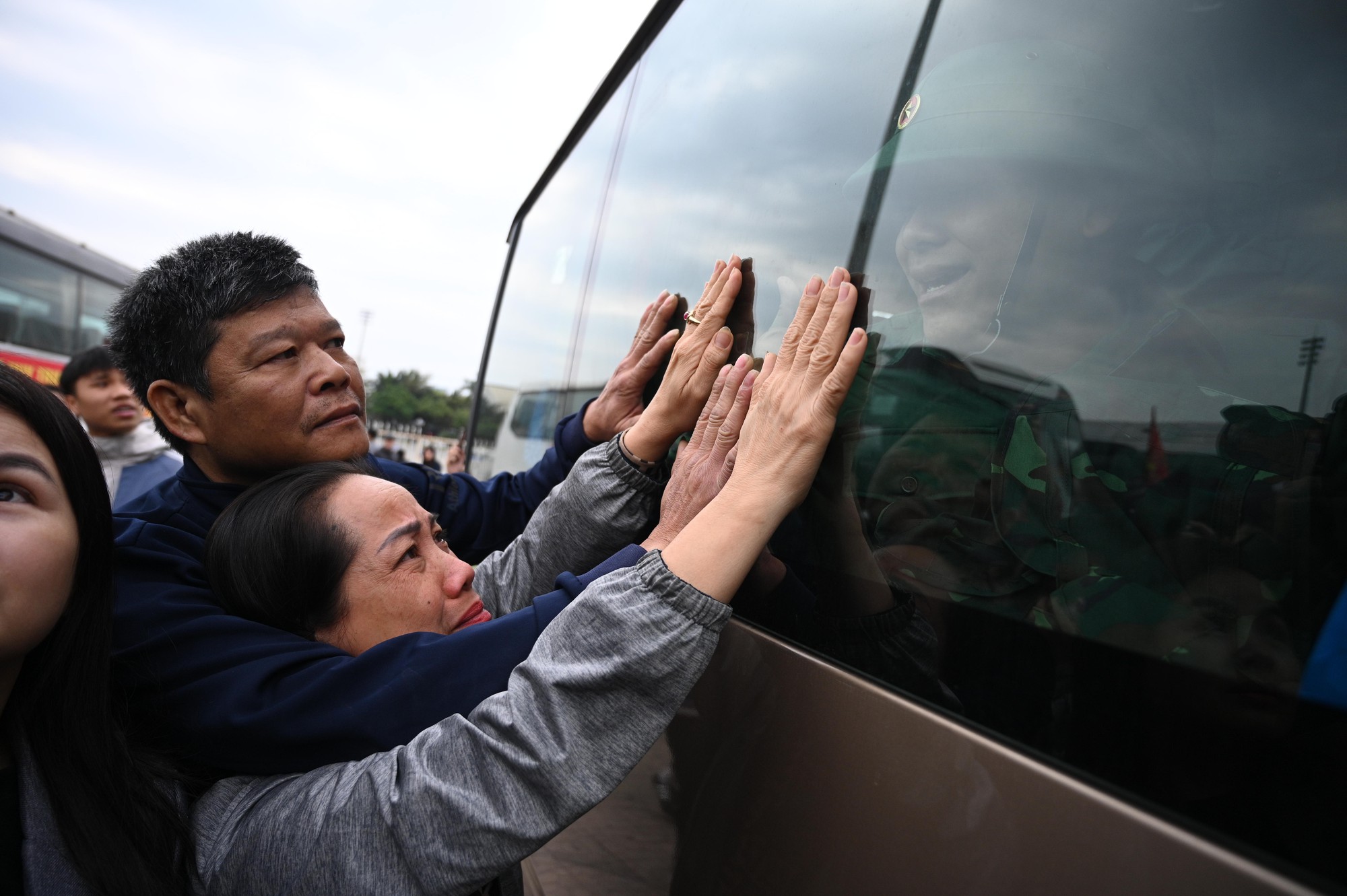 Khoảnh khắc những chuyến xe lăn bánh rời điểm giao quân, nhiều gia đình không giấu được xúc động nhưng vẫn nở nụ cười động viên, tiếp thêm tinh thần cho các chiến sĩ trẻ.