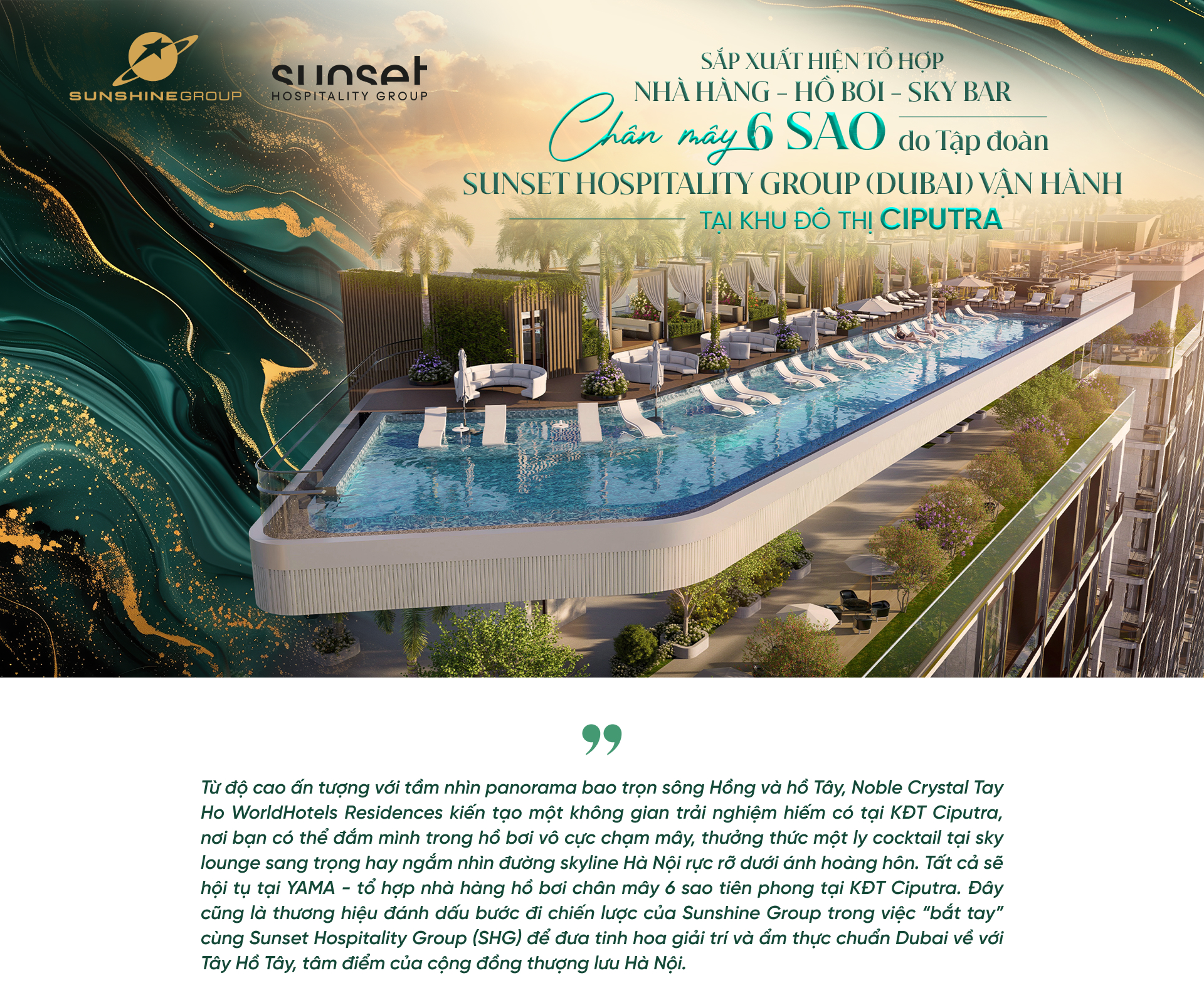 Với YAMA trên đỉnh Noble Crystal Tay Ho WorldHotels Residences, Sunshine Group không chỉ mang về một “điểm đến đắt giá” dành riêng cho cư dân tại Ciputra mà còn đang định hình lại bản đồ giải trí cao cấp của khu đô thị kiểu mẫu này. Từ đây, Hà Nội sẽ có một không gian ẩm thực giải trí rooftop đạt chuẩn toàn cầu, tương tự như những rooftop “signature” tại Tokyo, Singapore hay Dubai. Đây cũng là bước đi chiến lược của Sunshine Group trong việc nâng tầm giá trị sống tại Tây Hồ Tây và kiến tạo những điểm đến mang dấu ấn vượt thời gian cho Hà Nội.